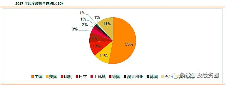 根据Solarpower Europe的统计,2017年印度实现光伏装机量为9.63 GW,新增装机占全球占比约10%,并且印度是中国组件和电池最重要的出口市场,根据CPIA的统计,2017年中国太阳能电池的出口额有28.6%是由同印度贸易贡献的,印度市场占组件出口份额的29.8%,可以说是最重要的海外市场(根据Pvinfolink的统计,中国出口约1.2 GW电池,9 GW组件到印度),印度是中国光伏制造不容忽视的市场。
