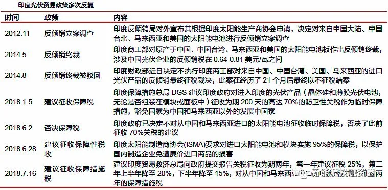 印度历史上曾经就对中国等多个国家出口到印度的光伏产品进行过反倾销调查,光伏贸易政策多次反复,2012年11月23日,印度反倾销局对外宣布其根据印度太阳能生产商协会申请,决定对来自中国大陆、中国台北、马来西亚和美国的太阳能电池进行反倾销立案调查。2014年5月22日,印度商工部就该案发布终裁,并建议征收0.11美元至0.81美元每瓦的反倾销税。最终,印度财政部选择不执行印度商工部的裁决,以无税结案。2017年7月,印度商工部反倾销局发布公告,称应其国内产业申请,决定对自中国大陆、台湾地区和马来西亚进口的光伏电池及组件发起反倾销调查。今年3月,印度商工部发布公告,决定终止上述反倾销调查。
