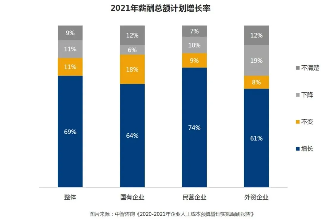 - 2021年企业薪酬总额预计增长的企业占比达到69%,低于2018年薪酬总额增长企业占比(83%)。