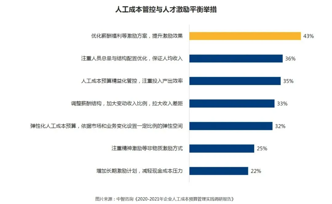在参与调研的企业中,43%的企业表示人工成本管控与人才激励平衡的首要举措是优化薪酬福利等激励方案,提升激励效果。近四成企业表示要注重人员总量与结构配置优化,保证人均收入,也有企业表示要开展人工成本预算精益化管控,注重企业投入产出效率。