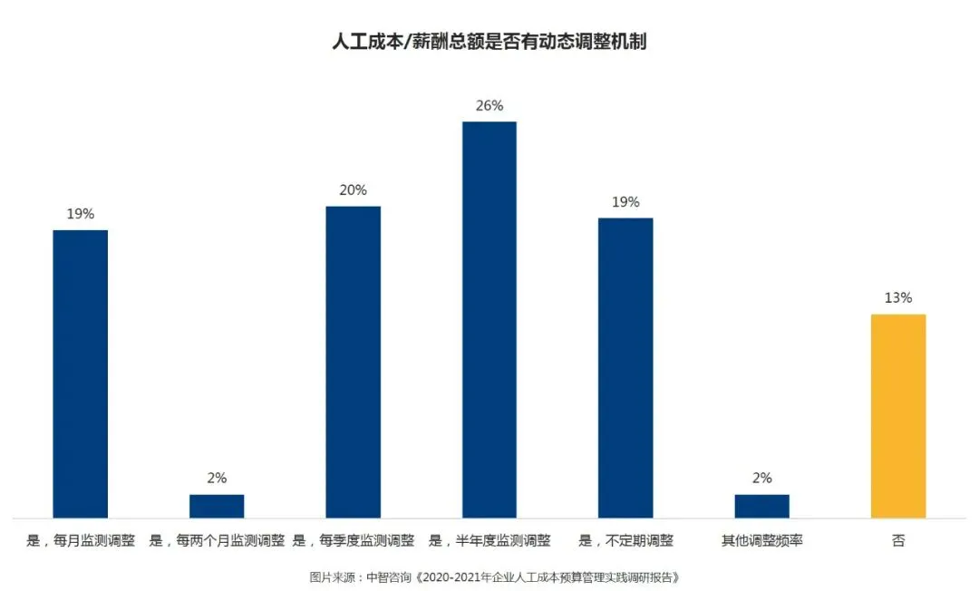 后疫情时期,企业的人工成本管控要求提升,年度的人工成本/薪酬总额确定后,企业在日常管理中通常需要配合动态监测和调整机制,一方面有效开展年度预算,另一方面根据业务变化及时调整年度预算中不合理的地方,有效推进实施组织人才的发展规划。中智咨询调研结果显示,近九成企业设有人工成本预算动态调整机制。其中,26%的企业调整频率为半年度,分别有两成左右的企业调整频率为季度、月度或不定期,少数企业采用每两个月监测调整,或月度监测、季度调整的方式进行人工成本的管控。