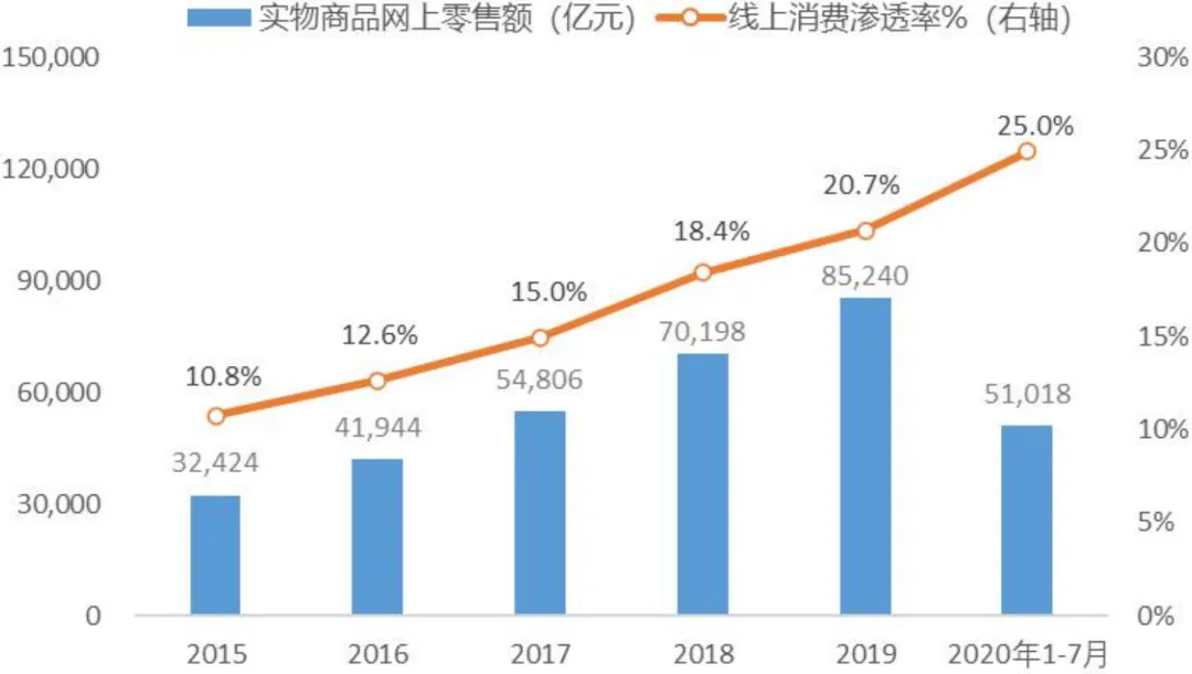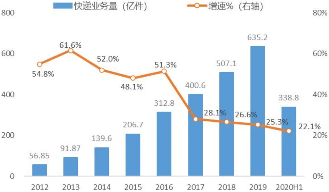 1.1 上半年快递行业走势先低后高,目前已完全恢复2020年一季度,新冠疫情最严重时期,全国各地道路与社区封锁、员工返岗率低,快递行业受到短暂冲击。如下图,今年1、2月份快递业务量与收入增速创下历年新低。二季度,随着快递企业复工率接近100%,居民消费向线上转移拉动市场需求,快递行业摆脱疫情影响,主要数据指标迅速反弹修复。二季度单季我国快递业务量增速高达36.8%,创近几年新高,日均快递处理量2.4亿件,与去年同期最高日处理量持平;业务收入增速23.5%,达到去年同期水平。整体来看,今年上半年(1-6月),我国快递行业共完成业务量338.8亿件,同比增长22.1%,已回归最近3年业务量增速的平均水平,国家邮政局近期维持全年业务量740亿件目标不变。由于疫情使线上消费占比加快提升,7、8月快递业务量增速仍保持在30%+的水平,超过去年同期。考虑到下半年国家刺激内需、强调“内循环”,四季度又是网购与快递的传统旺季,我们预计全年业务量有望超官方预期,落在760~800亿件区间甚至更高。上半年全国快递业务收入3823.8亿元,同比增长12.6%,而2019年同期收入增速为23.7%,增速下滑主要受快递平均价格下降以及一季度行业收入整体负增长拖累。疫情导致快递行业价格竞争加剧,如图4,今年上半年快递平均价格为11.3元/件,较去年同期下降7.8%,价格增速从去年底的-0.9%连续两个季度大幅下滑。从我们追踪的义乌快递价格来看,单月均价从2月高位4.48元/件一路降至5月3.01元/件,降幅高达32.8%。1.2 驱动力:线上消费爆发,疫情强化快递基础设施属性