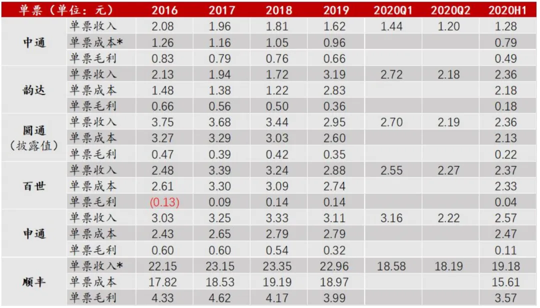 快递行业进入巨头竞争阶段后,业务量与市场份额、单票成本是各家最重视的经营指标,“价格战”、数字化改造、自动化投入等所有的手段都是为了前者(业务量与份额)增加、后者(单票成本)下降。上半年受疫情影响,行业竞争加剧,通达系快递巨头出现分化,CR6集中度进一步提升,单票价格继续下探,整体呈现“增量大于增收”的情形。同质化的电商快递市场中通达系正激烈“厮杀”,顺丰则凭借时效件、特惠电商件市场差异化的发展策略异军突起,成为今年经营业绩最亮眼的快递公司。如图7,今年一季度受疫情影响加盟制的通达系快递复工受到影响,业务量增速基本都在个位数甚至负增长。而二季度整个快递行业增速迎来“报复式反弹”,中通、韵达、圆通、顺丰二季度增速均在45%以上,超过2019年全年增速。整个上半年,通达系快递巨头业务量增速出现分化,中通(29.8%)、韵达(29.9%)、圆通(29.8%)三家高增速处于同一梯队,申通(18.5%)和百世(10.5%)低增速,且落后于行业平均增速(22.1%)。顺丰直营模式受疫情影响小,叠加特惠电商件的快速放量,上半年业务量增速达到81.4%,其中1季度逆市大增77.1%。总的来看,快递巨头业务量增速分化,顺丰>韵达、中通、圆通>申通、百世。巨头业务量增速分化带来了市场份额的变化。如图8,中通与韵达的市场份额继续保持稳步提升,较年初分别增长1.5pct和0.8pct,行业前两位地位较稳固。第三位的圆通市场份额为14.6%,较年初微增0.2pct。行业前三占据快递市场的半壁江山(51.8%),值得注意的是,前三之间份额差值自2017年以来正逐年拉大。顺丰受益于高增速,市场份额较年初提升3.2pct,反超百世和申通来到行业第四位。百世和申通市场份额较年初分别下降1.3pct、1.2pct。总的来看,疫情使中小快递企业加速出清,快递业务量仍在快速向头部企业集中,当前行业CR6达到83.6%,较2019年末提升3.2个百分点。表1:快递行业前6大公司(通达系+顺丰)业务量及增速、市场份额情况疫情影响下,上半年电商快递竞争持续激烈。全行业单票价格较年初下降7.8%,12.6%的业务收入增速远小于件量增速,尤其在同质化竞争的电商快递市场,通达系巨头普遍表现为“增量不增收”。如表2,上半年通达系收入增速仅中通保持1.5%的个位数增长,其余四家全部负增长,依次为圆通(-2.9%)>申通(-6.2%)>韵达(-7.2%)>百世(-12.3%)。分季度看,一季度受加盟网点人员复工率低影响,通达系业务收入均同比下滑超过15%;二季度收入增速出现分化,中通、圆通大幅转正,申通、韵达基本无增长,百世收窄至-5.4%。快递巨头收入表现疲弱也造成了快递服务品牌集中度指数CR8自2月份的86.4一路降至7月的83.6。顺丰快递直营模式在疫情期间保持正常运营,凭借时效件、特惠电商件快速放量的优异表现异军突起,成为今年经营业绩最亮眼的快递公司。顺丰一季度速运物流及供应链业务收入逆市大涨38.1%,二季度收入增速升至44%,整个上半年比去年同期增长41.9%,远高于其他快递巨头。 表2:快递行业及主要公司(通达+顺丰)业务收入情况注:Q1\Q2数据由每月披露的经营数据加总所得。H1统计口径为半年报披露的快递业务收入,非总收入。顺丰收入统计口径为速运物流及供应链业务,不含其它。收入降幅大于成本降幅,快递巨头单票毛利大幅下滑。如表3,我们整理了今年上半年通达系与顺丰的单票收入、成本与毛利情况:● 单票收入方面:“价格战”与票重下降导致单票收入大幅下跌。各巨头二季度单票收入均创下新低,符合我们对市场的调研情况,例如义乌“3元发全国”带来的战略性亏损。上半年,韵达、圆通、百世单票收入处于同一水平,约为2.36元/票,分别较年初降低26%、20%、17.7%;申通单票收入2.57元最高,但较年初仍降低17.4%;中通单票收入值由于统计口径不同与其他几家不可比,较年初降低20.1%。顺丰则由于特惠电商件占比提升,单票收入下降16.5%至19.18元。● 单票成本方面:由于各家快递巨头业务量继续增长带来的规模效应,全网数字化、自动化水平提升带来的成本优化、效率提升,以及2-5月高速公路免费政策,单票成本延续下降趋势。上半年数据(可比口径),圆通单票成本最低为2.13元,依次为韵达(2.18元/票)、百世(2.33元/票)、申通(2.47元/票)。就成本优化力度来看,韵达单票成本较年初下降最多,达到23%,后面依次为圆通18.1%、中通17.7%、顺丰17.7%、百世15%、申通11.5%。● 单票毛利方面:通达系快递单票毛利值由高到低依次为中通、圆通、韵达、申通、百世,圆通首次反超韵达。由于各巨头单票收入降幅大于成本降幅,单票毛利均大幅收窄、毛利率下滑。就降幅来看,申通单票毛利降幅最大,较年初下降0.21元,其后依次为韵达、中通、圆通与百世,分别下降0.18元、0.17元、0.13元与0.1元。通达系快递巨头单票毛利率全部下滑,其中圆通单票毛利率录得最高值9.3%,且降幅最小。顺丰上半年表现最好,单票毛利3.57元,虽较年初降低10.5%,但由于成本管控得力,单票毛利率18.6%,较年初增加1.2pct。资料来源:公司公告,招商银行研究院