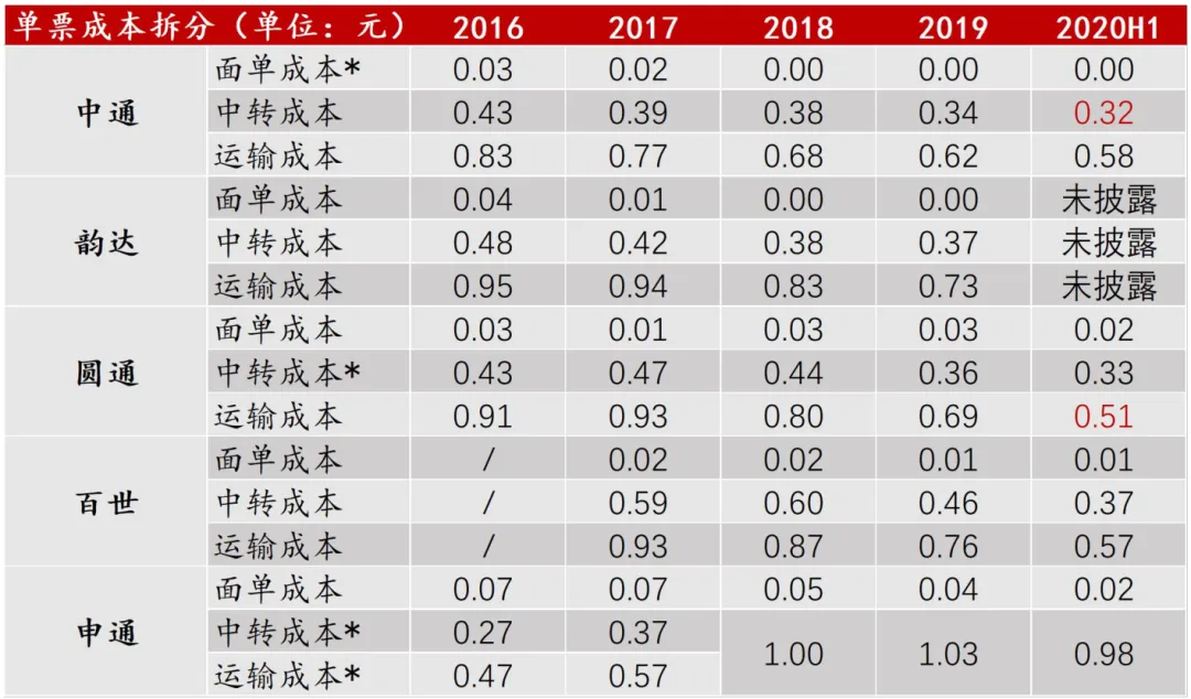注:1、中通单票收入统计口径不含派费,单票成本使用中转+运输+物料+其他成本计算得出;2、圆通单票数据采用年报披露值,与我们计算结果基本接近;3、顺丰2019年快递业务单票收入采用年报披露值。我们将通达系快递单票成本(扣除派费)拆分来看,中转成本和运输成本均有不同程度的降低。如表3,除了韵达本次半年报未披露细分成本构成外,已披露的中通中转成本最低为0.32元/票,圆通的运输成本最低为0.51元/票。其中圆通单票中转(不含网点中转费用)+运输成本最低为0.84元/票,低于中通0.9元/票、百世0.94元/票、申通0.98元/票。表4:通达系单票成本(面单+中转+运输)拆分与对比注:1、中通面单成本并未单独披露,根据业务量近似估计;2、圆通单票中转成本不含网点中转费,仅使用中心操作成本计算。3、百世在半年报中披露二季度单票中转成本和运输成本,面单成本为估算。4、申通转运中心直营比例92.65%,中转成本与运输成本仅代表直营部分。2.3 主要快递公司上半年经营情况简评