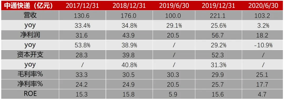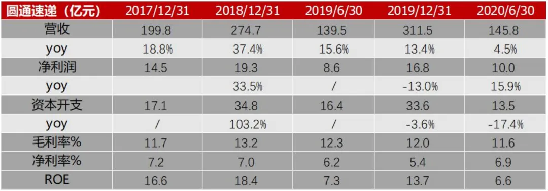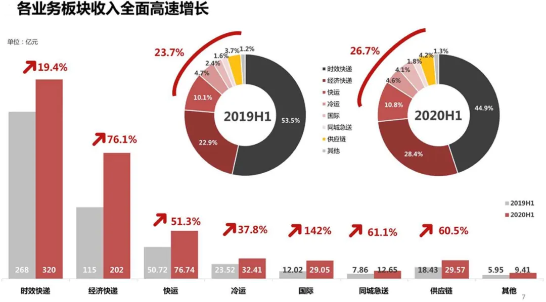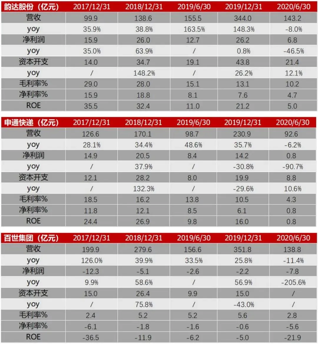 中通快递是通达系中经营最稳健的一家。除了业务量与市场份额稳居行业第一以外,净利润规模18.2亿也是通达系快递中最高的一家。2020上半年公司总营收保持正增长3.2%,由于上半年人力成本提升、抗疫物资采购等支出增加,净利润同比下滑10.9%。价格战使公司盈利能力承压,毛利率同比下降5.2pct至25.1%,净利率同比下降2.8pct至17.7%。圆通是今年上半年进步最大的通达系快递公司。公司总营收同比提升4.5%、净利润同比提升15.9%,是唯一一家净利润正增长的通达系快递公司。同时圆通毛利率同比降低0.7pct,净利率同比增加0.7pct。盈利能力得到明显改善,主要因为圆通上半年成本管控取得长足进步,管理层在中报电话会议中多次强调了全岗位数字化、全流程精细化管理等关键点,并且将考核与成本挂钩、设置激励绩效。此外,净利润增长圆通速递国际的航空货运业务功不可没,疫情使航空运输需求得到充分释放,飞机使用率与飞行小时数大幅提升,净利润暴增2115%。今年圆通资本开支会加大,虽然上半年受疫情影响资本开支同比下降17.4%,但下半年将会追赶项目进度,计划完成北京、重庆等转运中心改建项目,全网快递运能将达到4000~4500万票/天。9月1日,圆通公告阿里巴巴计划以66亿元增持其12%股份,交易完成后阿里合计持有圆通22.5%的股份,控制力进一步加强。韵达、申通、百世上半年营收与利润均出现不同程度下滑。韵达业务量保持快速增加的情况下,营收下降8%,净利润下降46.5%,“增量不增收、增量不增利”,半年报给出的主要原因有:1、货品结构优化,快递单票重量下降,进一步降低单票的资源成本和收入;2、基于当前快递市场的发展,公司在部分区域采取合理的市场策略(价格战)。此外,对末端网点派费的补贴、人员抗疫物资的支出以及持续高强度的资本开支蚕食了盈利,毛利率10.2%、净利率4.7%,分别下降4.9pct、3.4pct。值得注意的是,韵达的核心竞争力并未弱化,成本方面,凭借一直以来对转运中心自动化、物流系统研发方面的大力投入,中转、运输核心环节成本保持在较低水平。服务方面,从国家邮政局7月披露的快递业申诉情况来看,韵达综合表现稳定在通达系前两位。申通和百世业务量未跑赢行业平均增速,市场份额较年初萎缩,疫情叠加价格战使利润与盈利能力(毛利率、净利率)均大幅下滑,具体数据参见表7(百世为集团口径,包含快运、小店等业务)。总之,下半年快递价格企稳以及传统旺季来临都有利于快递巨头修复报表。快递公司短期盈利下滑,风险可控。一方面,通达系快递整体现金储备充裕,截至6月末百世29亿、申通41亿、圆通73亿、韵达98亿、中通137亿;另一方面,阿里上半年增资圆通、认购百世可转债,投资韵达2%的股份,对电商快递板块投入加大、控制力增强(阿里成为整个通达系的重要股东),降低通达系快递经营与财务风险。表7:韵达股份、申通快递、百世集团2020H1各项财务指标顺丰是2020年至今表现最好的快递公司。疫情使人们不得不重视直营模式的稳定性,承担抗疫物资运输使顺丰品牌价值提升。受益于稳定的时效件业务,以及特惠电商件业务对中端电商市场渗透率提升,顺丰快递板块业绩快速上涨。如图9,高品质消费线上化提速以及航空运力需求大增,时效快递收入增长19.4%;经济快递收入同比增长76.1%,同时规模效应以及网络快慢分离使单票成本下降。顺丰前瞻性的综合物流布局也取得成效,其中快运板块凭借顺丰快运打中高端市场、顺心捷达打低端市场,上半年业务收入同比增长51.3%,保持高增长势头;生鲜到家、医药(包括疫苗)配送对冷链运输需求增加,上半年冷运及医药业务收入增长37.8%。此外国际业务、同城急送、供应链业务均取得较大涨幅。除了通达系快递、顺丰、京东与中国邮政以外,极兔和众邮快递上半年业务量也得到快速扩张,根据调研情况反馈,极兔目前日均单量在500~600万量级,虽然距离巨头(大于2000万票/天)仍有较大差距,但足以引起关注。极兔依托OPPO、VIVO的加盟商,与拼多多关系密切。众邮快递创始于京东,是对加盟制快递的尝试。虽然两者背后多多少少都有电商巨头的资源支持,但是通达系快递在网络建设(数字化、自动化投入)、成本管控(各环节成本优化)构筑了足够高的壁垒,如何充分降低单票成本做到稳定盈利、如何在业务量继续增长的情况下保持稳定的服务质量,仍是摆在极兔和众邮面前的难题。