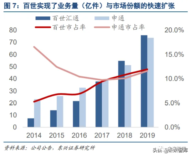 2018 年,百世快递业务量首次超越申通快递,市场份额超过 10%,标志着百世在业内基本站稳脚跟。但市 场份额快速扩张的同时,我们也看到了百世作为行业后发者进行追赶所要付出的巨大代价:虽然依靠补贴烧 出了市场,但长期的低价策略积累了大量相当价格敏感的客户,对自身的减亏形成了一定的阻力。虽然体量 与申通已经相当,但单件盈利层面依然有一定差距。