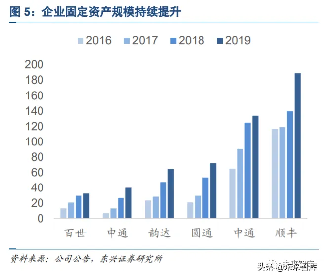 但对于快递这个强竞争性行业来说,企业追求短期经济效益最大化(有限度地提升转运中心产能),长期来 看很可能会导致市场份额的永久性丢失,是不可接受的。因此,快递企业普遍采取大幅扩产的策略,直至能 够基本应付需求峰值,出现整体性的冗余。从快递企业固定资产投资的增长情况来看,为了应对持续增长的日常需求与峰值需求,各快递企业还在不断 投入设备,对现有转运中心进行改造。可以预计的是,未来一段时间里,对电商件依赖较强的通达系快递还 必须要维持一定程度的冗余产能,这也是导致电商件市场竞争加剧的一个重要因素。