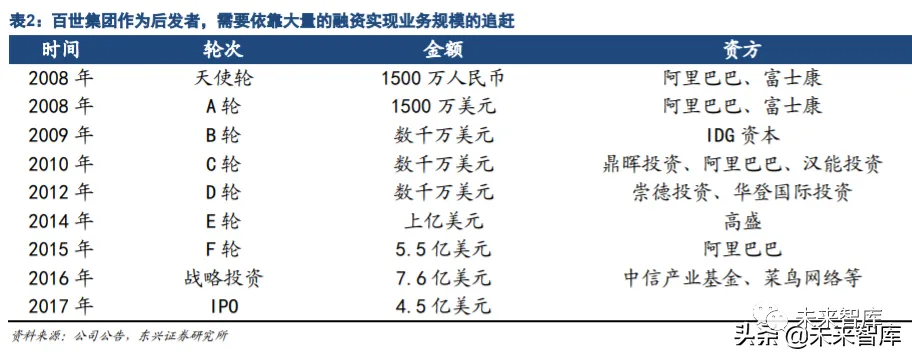 百世快递的追赶历程离不开资本市场的持续投入。从 2007 年成立开始,百世就不断获得阿里巴巴等国内外 资本的投资,到 IPO 为止累计募集资金近 20 亿美元。