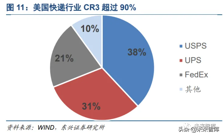 虽然我国快递现阶段的格局离寡头垄断还有很大差距,但其他地区快递行业的格局基本都验证了这一事实。比如美国和日本,CR3 基本都在 90%或以上,这都是长期末位淘汰后形成的结果。不出意外地,我国快递 行业未来的格局也会向寡头垄断发展。
