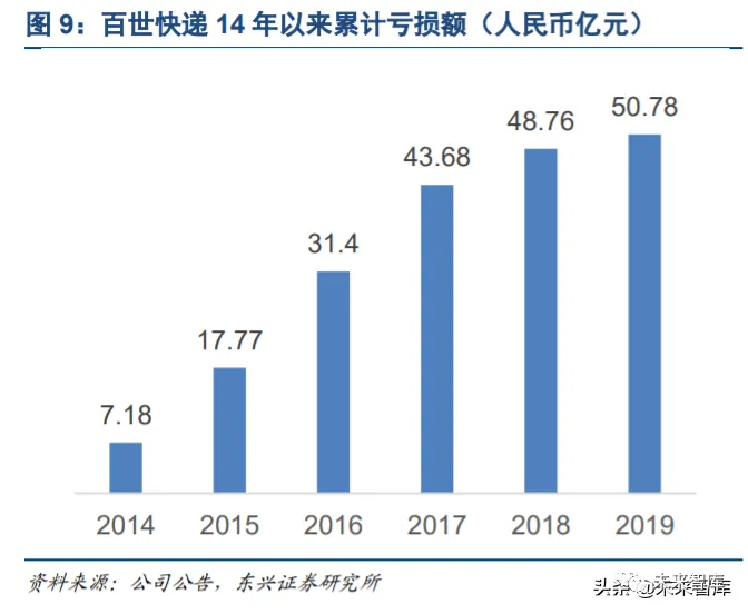 这些资金在百世对其他老牌快递企业的追赶过程中起到了非常关键的作用。从 2014 年算起,百世快递连年 亏损累计亏损额超过 50 亿元,其中 14-17 年是亏损最为严重的几个年份,每年亏损额在 10 亿元以上。若缺 乏资本市场持续的资金支持,这一追赶过程基本不可能实现。然而,即使已经在市场份额方面逐步赶上,百 世的市值依旧与行业龙头的中通有巨大的差距。