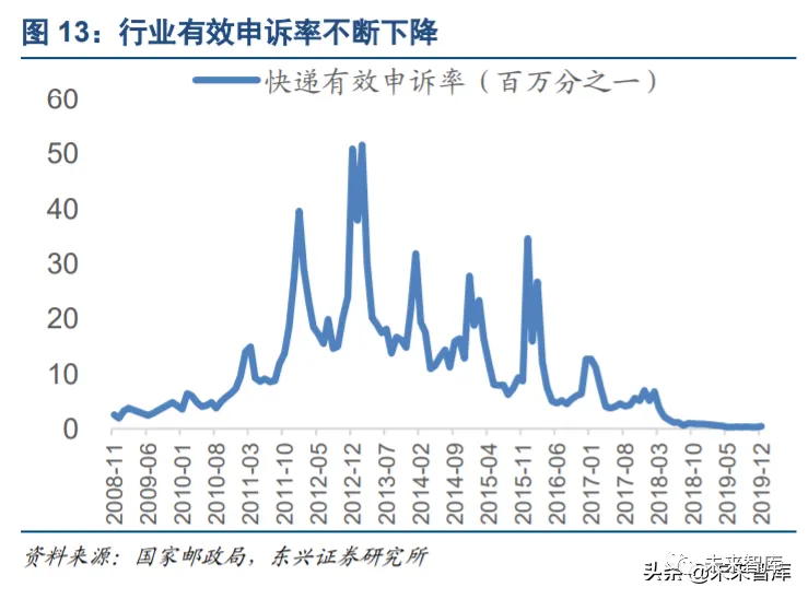 而从快递行业这两年的趋势来看,快递有效申诉率的大幅度下降,标志着快递企业在物流稳定性与货物破损 率方面都已经实现长足的进步。整体不到百万分之一的有效申诉率也使得各家快递的配送质量在消费者层面 变得很难区分。