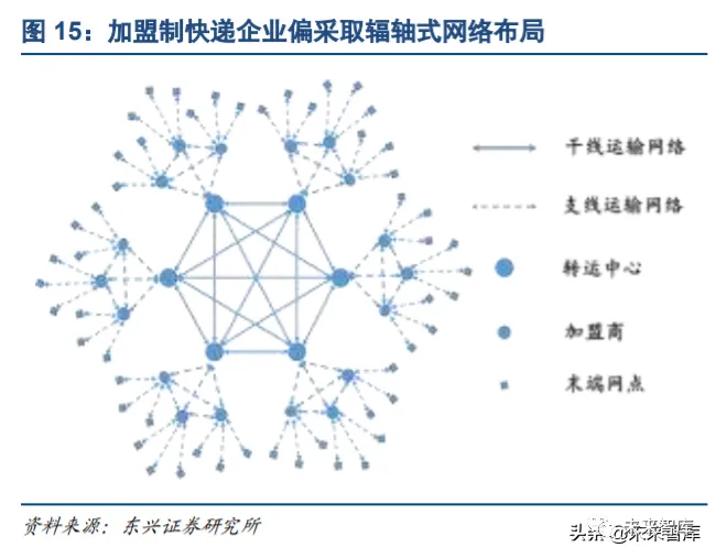 现阶段,各家快递企业都采取辐轴式的网络布局方式:以转运中心为核心物流节点,核心物流节点间以干线 运输相连接;核心物流节点以支线物流网络连接到各加盟商以及更末端的终端网点。由于快递公司都需要对 国土进行全面网络覆盖,可以想象各家快递公司的配送网络之间会存在较大的重合。这也就意味着,任何一家快递公司在全国任何一个区域都面临着其他所有主流快递公司的竞争压力。行业的竞争(在国内)是不存 在地理区位限制的。