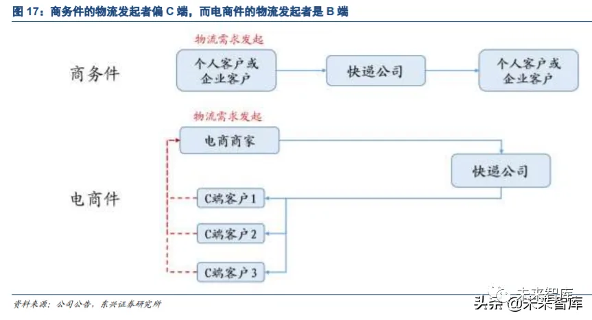 简而言之,商务件比较依赖 C 端客户,更重服务;电商件由于物流发起者是 B 端用户,发货量大,主要从商 业逻辑考虑,则更重性价比。