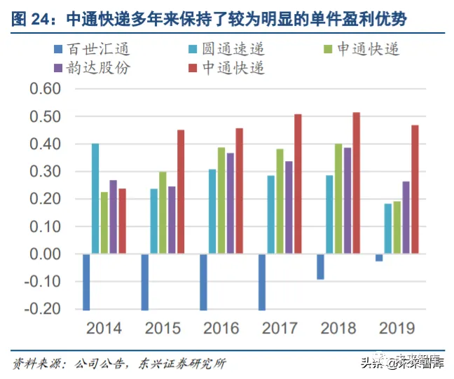 之前说到,行业业务量增速从 17 年开始有明显下坡,从 16 年的接近 50%降至 17 年的 30%左右,此后行业 竞争进一步加剧。我们可以看到,2018 年之前,各家主流快递公司的业务量增速相差巨大,有明显高于行业 增速的百世、韵达,也有低于行业平均增速的申通。这时候主流快递公司的生存压力不大,除了百世还处于 亏损外,其他几家公司的单件盈利差距并没有明显拉开。