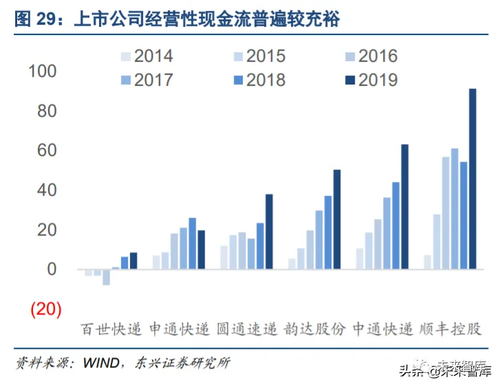 我们都知道,对于企业的生存来说,利润并不是第一位的,现金流才是。而从各家上市公司的报表来看,直 到 2019 年年报为止,虽然价格战对行业整体的业绩增速已经带来了负面影响,但各企业现金流层面依旧较 为充沛。从这个角度来说,虽然价格战打得很凶,但通达系快递总部的生存压力都不算大。