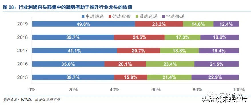 而事实上,利润向行业龙头集中的情况在这几年表现也的确比较明显。不考虑还在亏损的百世快递,如果我 们把剩下 4 家通达系快递公司的利润总和看作一个整体,那么头部企业占整体利润的比例是明显上升的。19 年中通快递的利润已经接近 A 股三家上市公司之和。可以想象,如果价格战加剧,则利润的阶梯化可能会更 加显著。而这种预期则会反过来进一步推升头部企业的估值水平。
