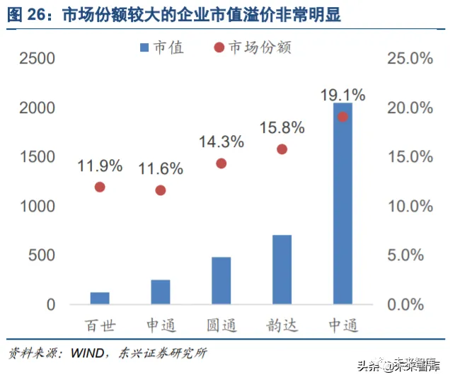 也就是说,不考虑其他外部限制因素,现阶段的“四通一达”间的价格战还会继续上演。而如果希望稳定获 取寡头垄断溢价,很可能需要参与者数量整合到 3 家或以内。这是笔者从逻辑推演与实际案例结合后得出的 一个初步结论。