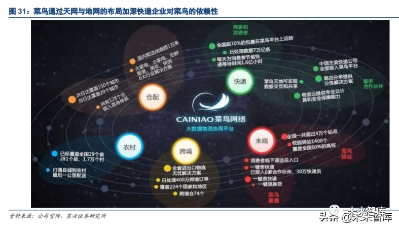 菜鸟物流向上直接对接电商平台,导入需求;向下对接快递公司的运力,并通过“天网”与“地网”的协同, 帮助快递公司实现降本增效。故菜鸟在成功实现了电商平台与快递公司“双赢”的同时,也强化了阿里在电 商物流链条中的话语权。