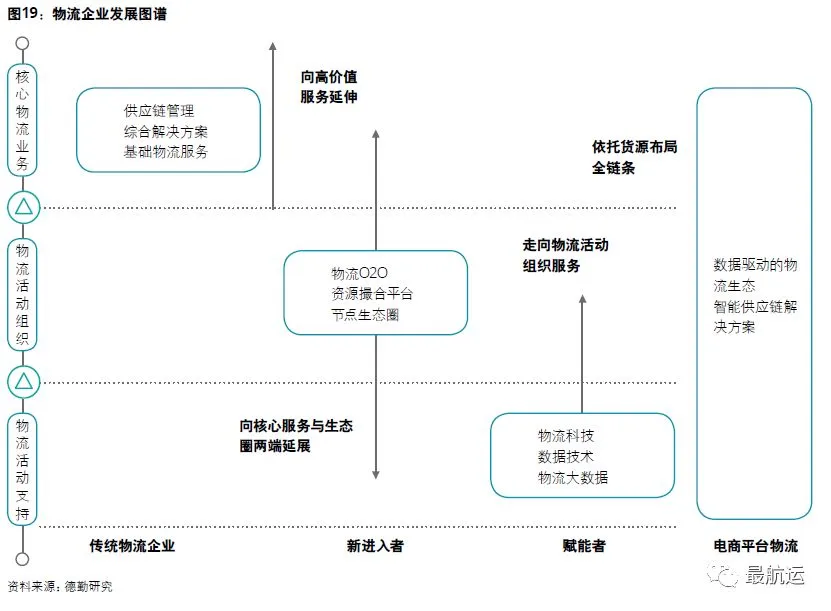 拨开“互联网+物流”风口的迷雾,德勤发现,布局“互联网+物流”的企业主要来自两个阵营:一是物流行业的新进入者,其特点是利用互联网技术深入物流业务本身,改变传统作业方式,直接参与行业竞争;二是行业赋能者,其特点是以技术与数据为抓手赋能行业,但不切入物流业务本身。