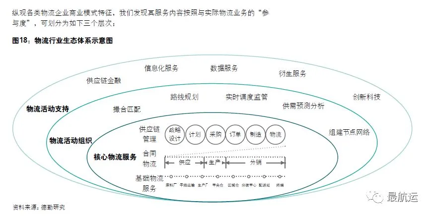 第三类则是立足物外,为物流活动提供各类辅助支持的企业。它们基于科技与数据,提供设施、设备、信息、数据等服务,从而赋能整个行业的发展。各阵营企业布局于不同圈层,并在其中进行着横向的位移与纵向的跃迁,推动着物流行业竞争者联盟的洗牌与格局的不断变迁。