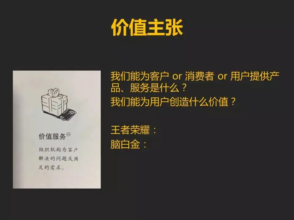 价值主张是为了给玩儿家创造更多的快乐,让玩家在团队协作和个人技能展示方面找到成就感和满足感,顺便赚点钱。当然赚钱这事儿不能这么太露骨的对外表达。