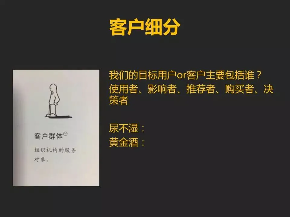 其实就是我们指的目标用户,我们为哪些群体提供服务,帮助哪些群体解决问题?哪些群体会为你的产品和服务最终买单?如果分析清楚了,恭喜你,这是一个有用的产品,如果模棱两可,很遗憾,做了也没用。客户细分里边会将客户按照使用者、影响者、推荐者、购买者、决策者进行等级划分。