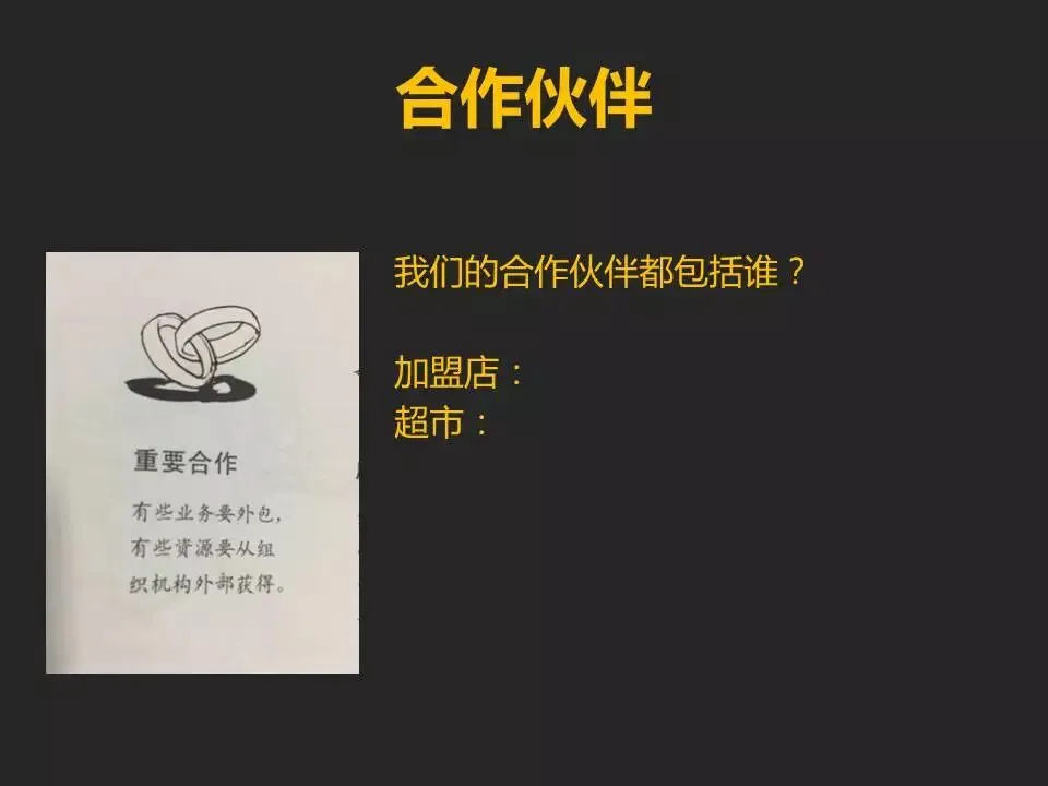 合作伙伴包括企业核心业务所涉及或者依赖的上下游服务商,甚至是竞争对手(有一天你也有可能会收购别人或者是被别人并购的哦,滴滴快的Uber/新美大/58赶集/京东拍拍/搜狗搜搜就是活生生的案例)。