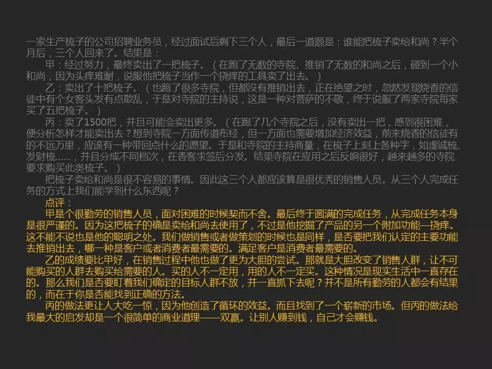 可是,我想说梳子卖给和尚这么一件事情,其实和在大街上对着美女耍流氓没有什么太大的区别。原因是这样的价值主张(商业道德)完全违背了正常人的三观,是会受到用户唾弃和鄙视的。当然把它当成一个商业模式的教材来研究,的确是比较经典。