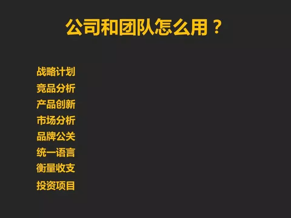 商业画布不仅仅只是一个工具,它更多的是一种思考方式和方法,通过科学的理论和真实的模块关联帮助我们去看清楚一家公司、组织、个人的人生观、价值观、世界观。又来!不至于我们因为没有它而过的稀里糊涂恍恍惚惚。在组织的应用场景:战略规划、竞品分析、产品创新、市场分析、品牌公关、统一讨论语言、衡量收支、对外投资等等。