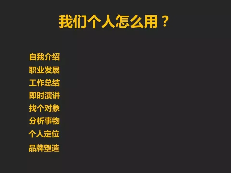 商业画布也不仅仅只是应用到企业和组织,它同样能够更多的被应用到个人。在个人的应用场景:自我介绍、职业发展、工作汇报、工作总结、即时演讲、找个对象、分析事物、个人影响力打造等等。