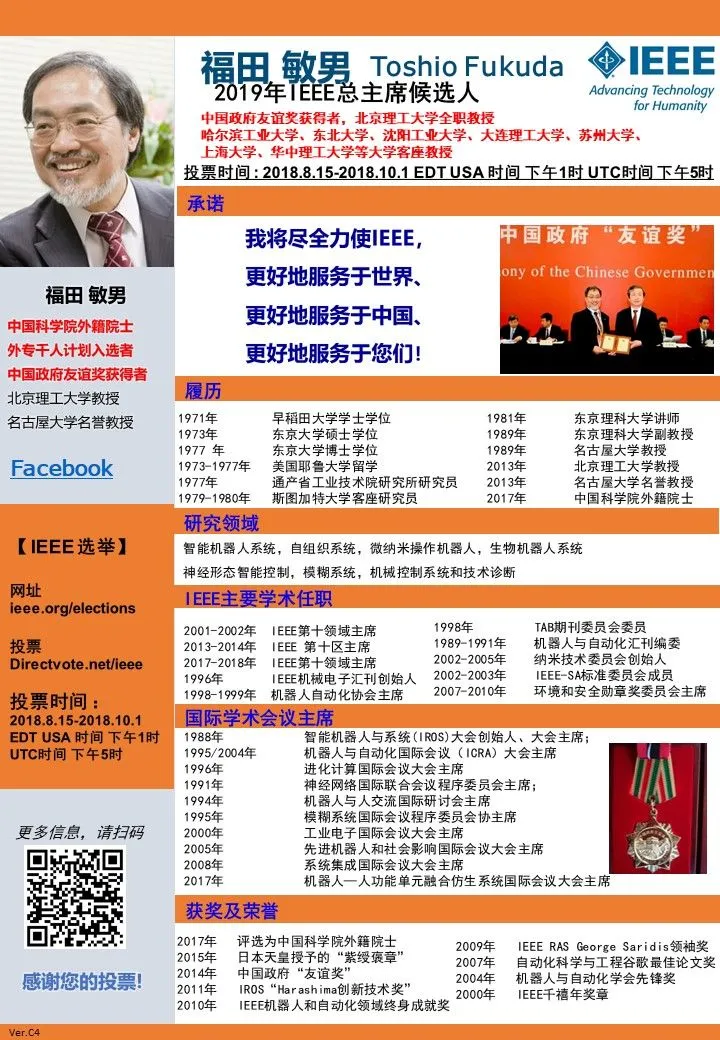 中国科学院外籍院士、外专千人计划入选者、中国政府友谊奖获得者福田 敏男(Toshino Fukuda)正在竞选2019年IEEE总主席,此次是亚洲人首次竞选IEEE主席。福田教授多年来为中国与世界各国的学术交流及合作做出了巨大贡献,广大IEEE会员及机器人行业同仁们可以进行投票支持,扩大亚洲在IEEE的影响力。