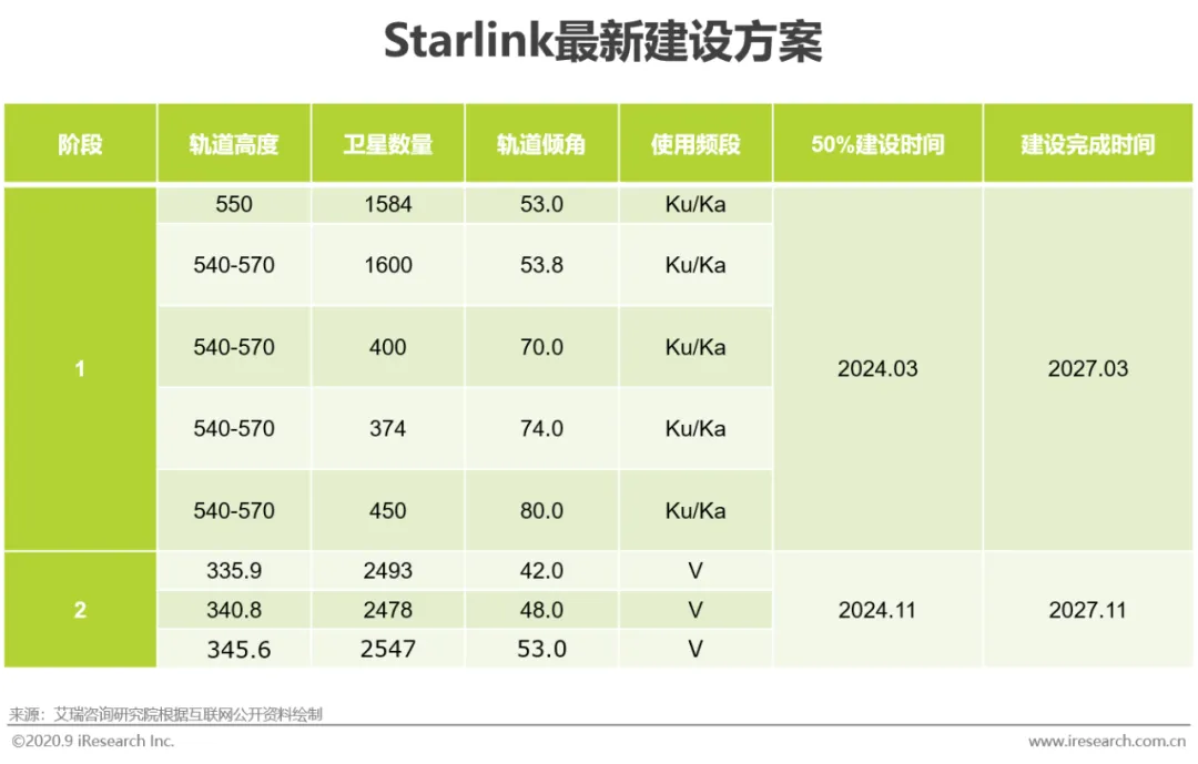 目前Starlink系统建设方案分为两个阶段,第一阶段位于550公里的4408颗卫星计划在2024年3月建设整个系统50%,2027年3月全部建设完成。第二阶段位于340公里的7718颗卫星计划在2024年11月建设完成50%,2027年11月全部建设完成。