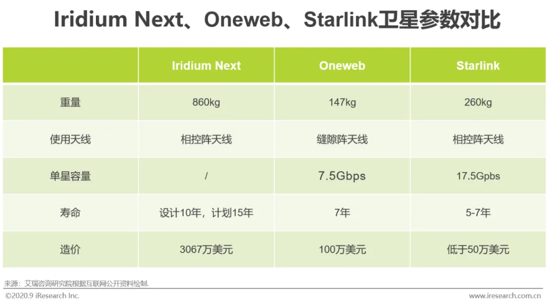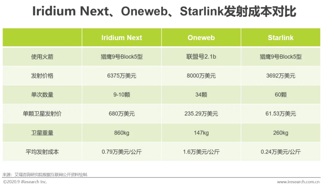 Iridium Next、Oneweb和Starlink本质上代表三种不同的模式,Iridium卫星外包、Oneweb联合研制、Starlink独立研制。Iridium Next外部采购卫星依然遵循传统卫星制造模式,Oneweb虽然改变了卫星制造模式,但仍需要与Airbus共同商议供应链,而SpaceX采用跨供应链甚至新建航天供应链,对成本的追求达到极致。