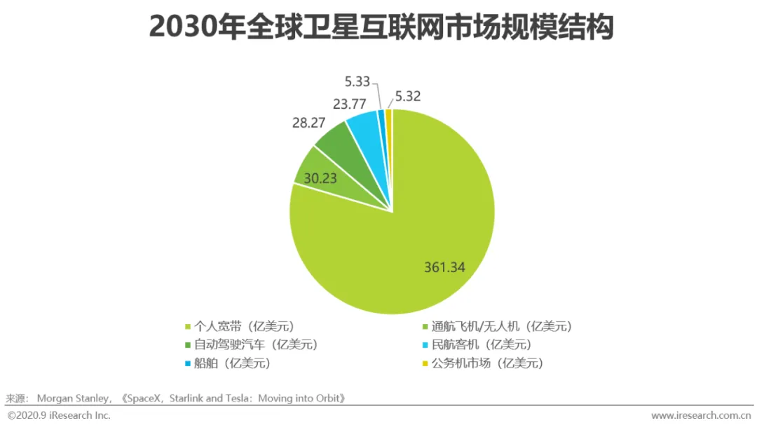 在摩根士丹利2019年9月发布的报告《SpaceX,Starlink and Tesla:Moving into Orbit》中,对全球卫星互联网的市场规模进行测算,到2030年全球卫星互联网市场规模454.26亿美元,详细的市场营收结构结果如下: