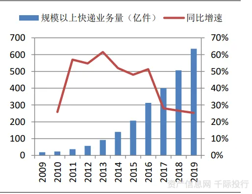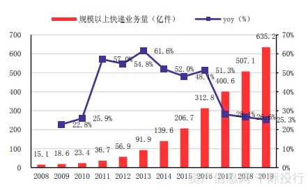 图 快递业务量变化趋势及增速(2008-2019)