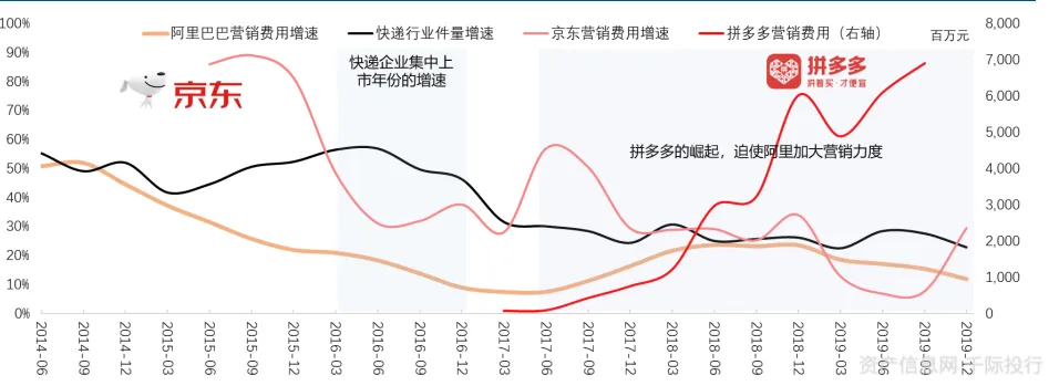 行业格局:电商件市场龙头初显,品牌件市场格局稳定。成本是行业竞争的灵魂,低议价能力与网络壁垒决定了成本是行业竞争的灵魂。同时驱动电商平台的 GMV 增速则主要依赖于电商平台的营销费用,我们可以得到这样的一个链条:电商平台竞争策略(竞争激烈)——营销费用(加大营销力度)——用户购买次数(增加)——平台 GMV(增加)——快递行业裹量(增加)。