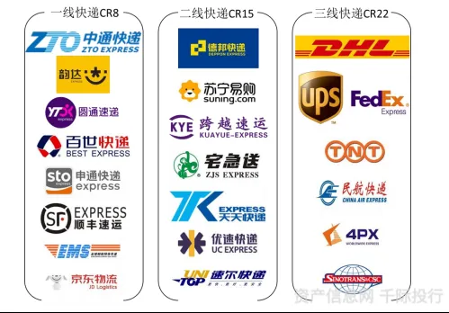 行业竞争格局:行业整合,中小企业出清,根据业务量的规模,快递公司通常可以分为三档,一线快递公司包括“通达系”、百世快递、顺丰控股、 中国邮政+EMS 以及京东物流,二线快递公司包括德邦快递、苏宁易购、跨越速运、宅急送、天天快递、优 速快递和速尔快递,三线快递公司主要是以 DHL、Fedex 为代表的外资公司,这类公司快递业务量较少,市场份额较低,在国内快递行业竞争中不断边缘化。但行业的市场份额离散程度并不够,主要快递公司的差异并没有显著拉大,行业格局仍需时日优化。