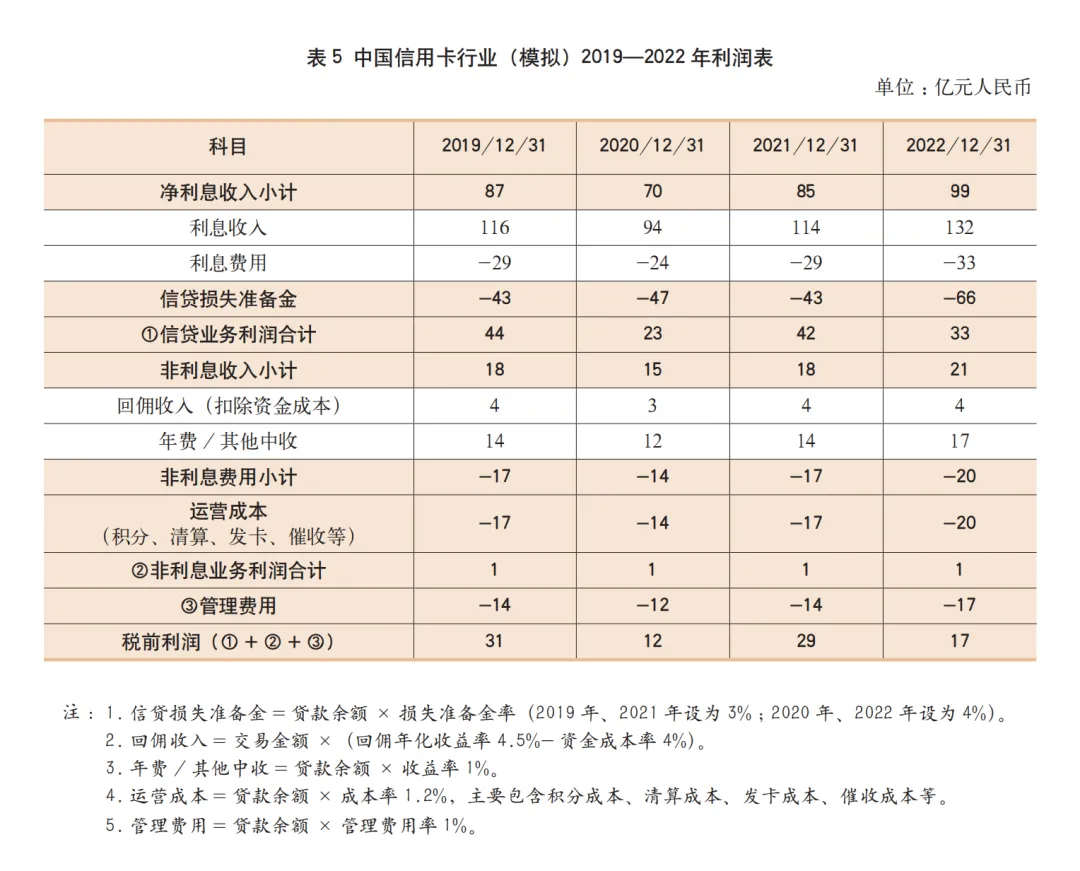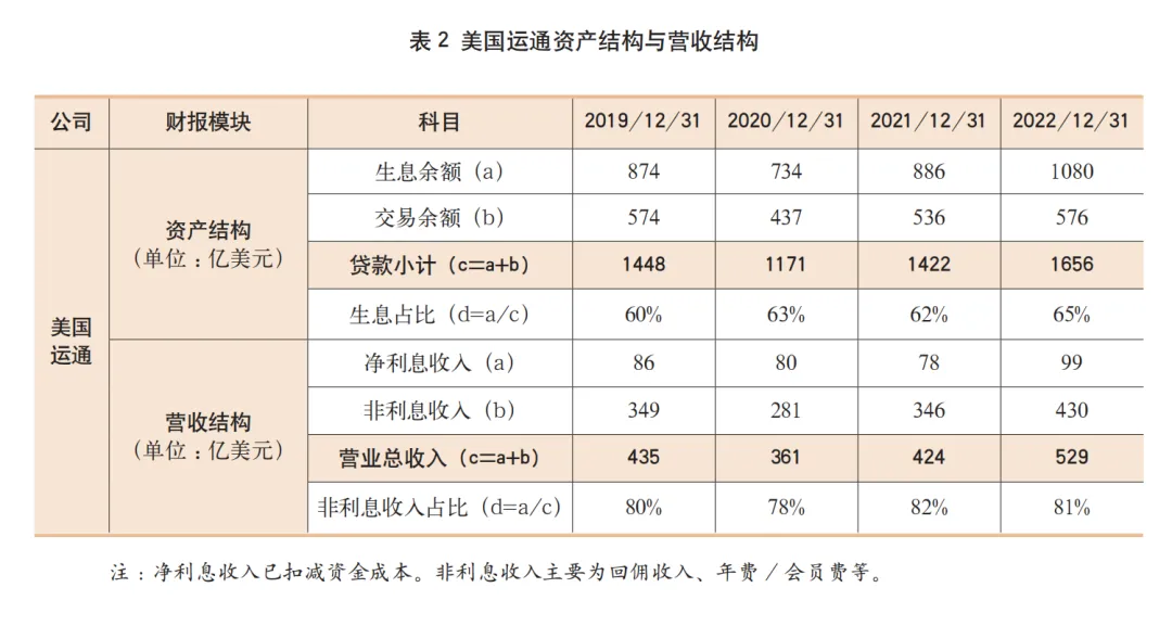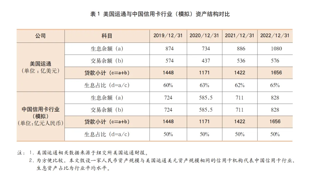 美国运通2019—2022年年报数据显示,其生息资产占比超过60%;而中国信用卡行业生息资产占比为50%左右(见表1)。