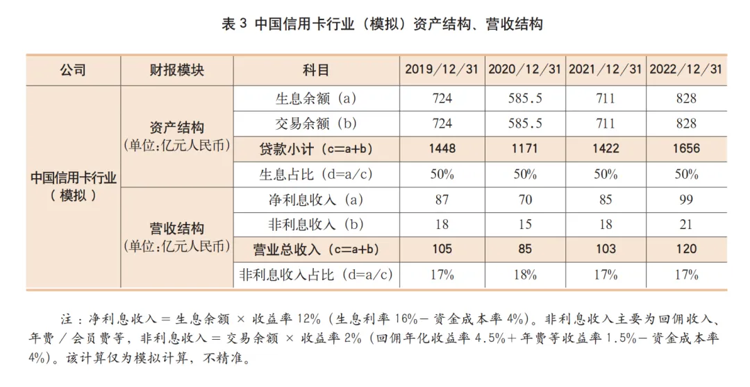 反观中国信用卡行业,由于回佣收入较低(回佣率仅为0.38%,年化收益率4.5%),与资金成本、运营成本基本持平,盈利空间较小,且纯交易带来的非利息收入占营收总额的比例不足20%,因此中国信用卡行业仍然需要依赖生息业务贡献主要营收。中国信用卡行业(模拟)资产结构、营收结构见表3。