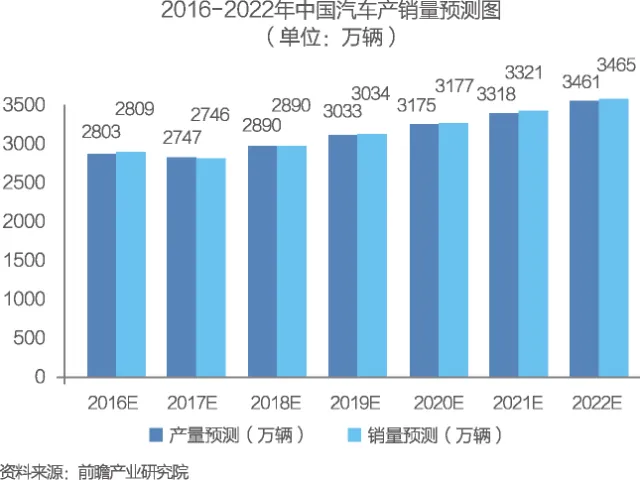前瞻分析认为,2016年,我国汽车产销量均将突破2800万辆;到2022年,汽车产销量将突破3400万辆的水平。