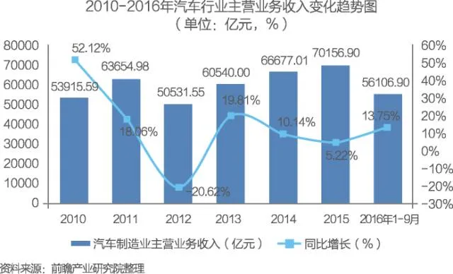 截至2016年第三季度末,我国汽车行业主营业务收入达到56106.90亿元,同比增长13.75%,增速较年初有所上升。2015年全年我国汽车行业主营业务收入达到70156.90亿元,同比增涨5.22%。