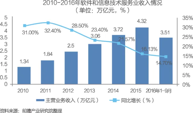 2015年1-12月快报显示,我国软件和信息技术服务业共完成软件业务收入4.3万亿元,同比增长16.6%,增速低于2014年4.5个百分点,但比1-11月提高0.4个百分点。