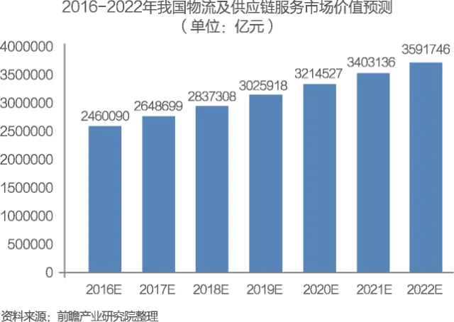 据前瞻预测,未来五年我国物流及供应链服务市场价值复合增长率将保持在10%左右,到2020年我国物流及供应链服务市场价值将达到3214527亿元。到2022年,市场价值达到3591746亿元。
