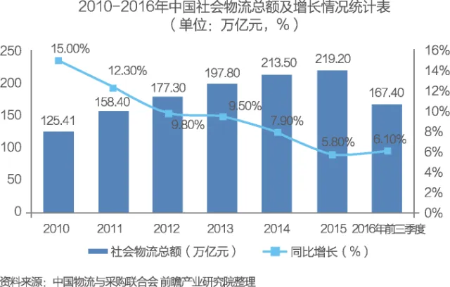 2015年全国社会物流总额219.2万亿元,按可比价格计算,比上年增长5.8%,增速回落2.1个百分点。分季度看,一季度49.4万亿元,增长5.6%,回落3.0个百分点;上半年104.7万亿元,增长5.7%,回落3.0个百分点;前三季度162.8万亿元,增长5.8%,回落2.6个百分点;全年社会物流总额呈稳中趋缓的发展态势。