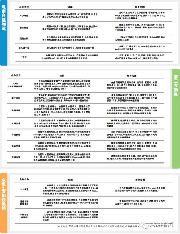 目前,我国电商物流服务提供方主要包括苏宁、京东等电商平台自建物流,EMS、顺丰、“通达系”等快递公司,如风达等落地配公司,以及人人快递等众包企业。