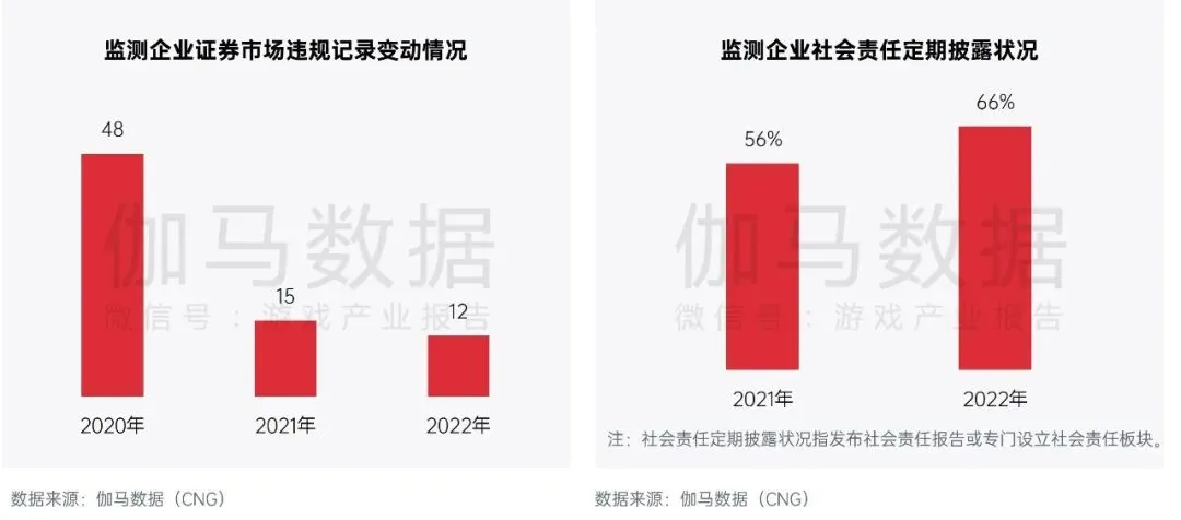 社会监管力度的提升,通常以增强产业合规性的方式展开,进而减少市场紊乱、社会资源浪费等现象,并体现公众层面对于企业履行社会责任的具体要求。本年度游戏产业外部监管与内部监管均有改善,其中内部改善的成果更为明显:以固定形式定期公布社会责任履责成果的企业占比进一步提升,设立或升级ESG工作小组的企业有所增加。推动监管改善的更深层因素来源于多个方面,首先,产业文化影响力及文化输出能力持续提升,带动社会监管需求上升;其次,产业历史布局存在部分教训与经验,促使社会监管持续展开;最后,产业升级带动企业强化自我管控,进而解决产业问题并抢占发展契机。从现阶段看,上述因素仍在持续,未来产业社会监管也将更为严格。