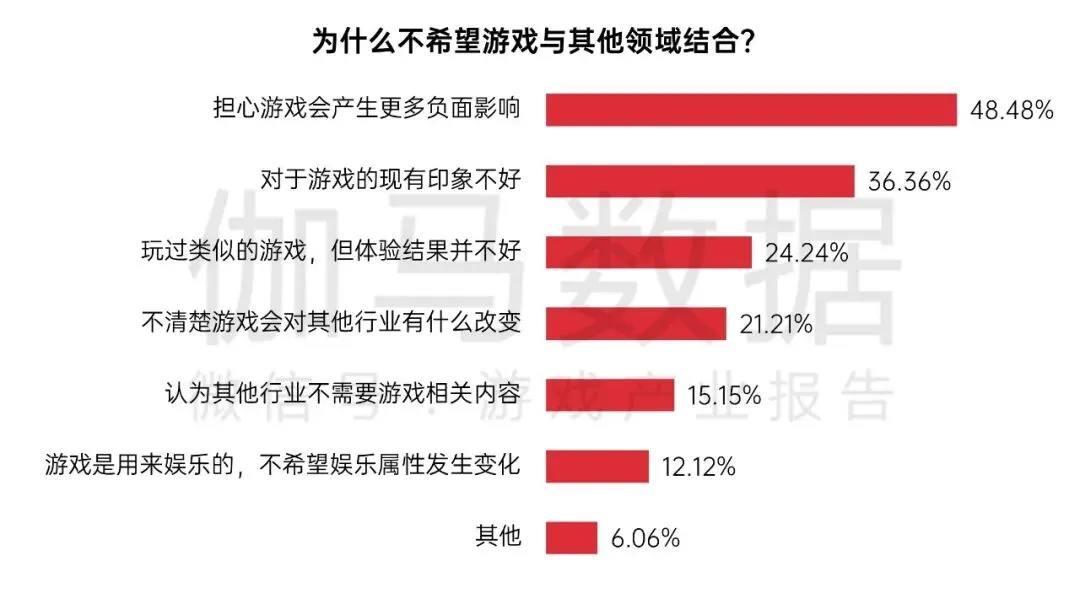 随着社会层面对游戏价值更深入的探索,游戏与其他领域的跨界整合已经成为产业发展的趋势,这让游戏在发挥娱乐价值的同时得以提供更深层次的社会价值。以本年度成果较为显著的“游戏+医疗”为例,游戏化数字疗法产品的诞生意味着游戏产业与其他领域的结合效果正朝向更落地、可量化的方向发展,例如为治疗效果承担部分责任。值得注意的是,以“游戏+”履行社会责任不仅产业偏好,社会公众的态度也较为正面,超6成受访者明确表达支持,“游戏+”的布局空间较广。反对意见主要基于对游戏的固有印象,例如担心其产生更多负面影响,但这并非“游戏+”所致,反而有望通过不断拓宽“游戏+”领域的边界、发掘游戏更多实用价值,从而转变公众的固有观念,作用于游戏产业的长期形象。