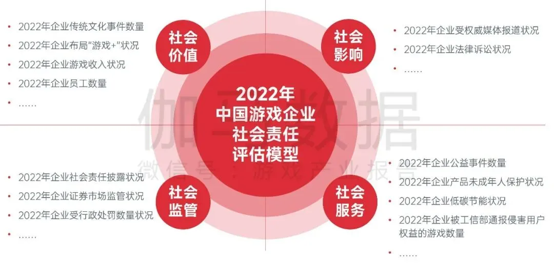 伽马数据依据模型评选出部分本年度“社会责任表现突出企业”。模型构建上,伽马数据从社会价值、社会影响、社会监督、社会服务四个维度构建企业社会责任评估模型,企业模型的维度选取与产业模型一致,仅在具体考核项目上进行调整。