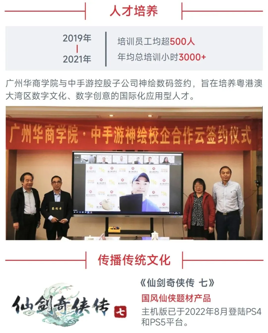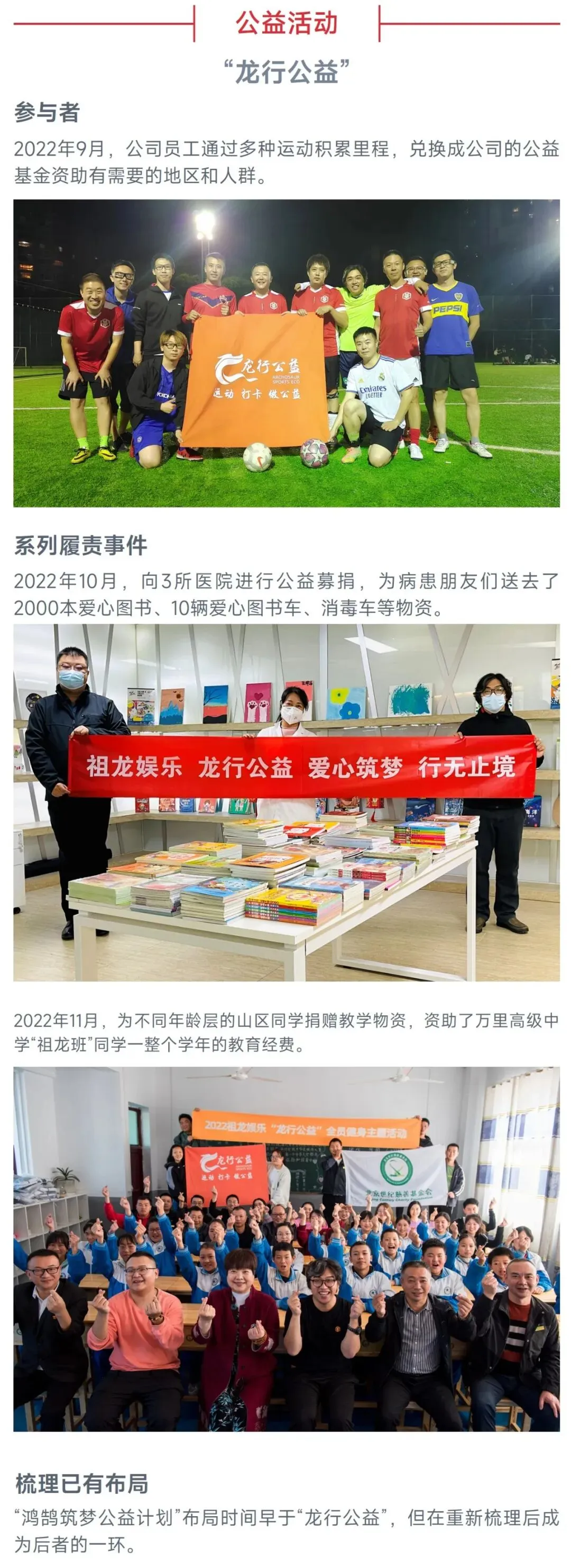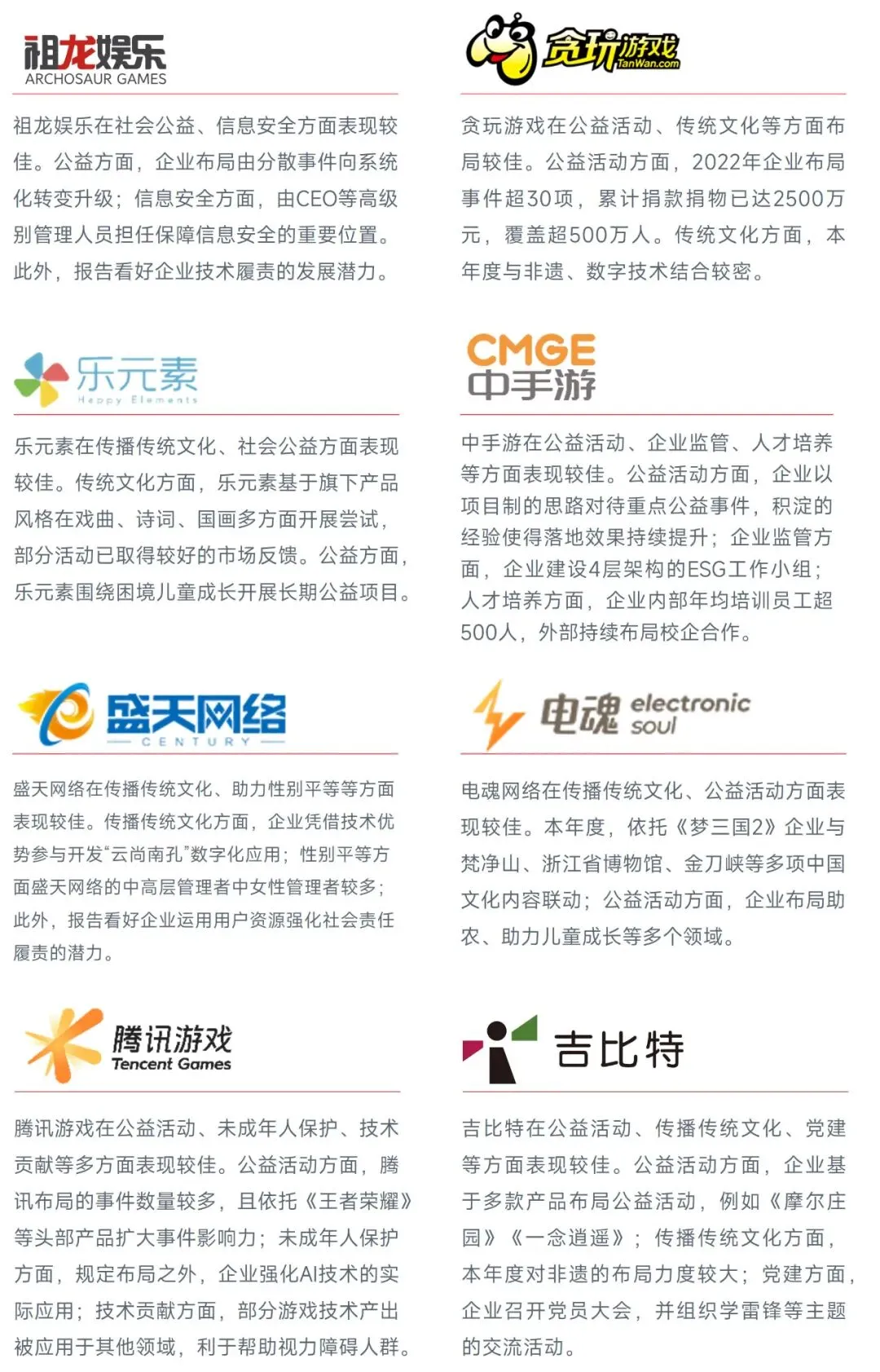 祖龙娱乐通过公益活动、人才培养、信息安全等方面履行社会责任,同时伽马数据看好企业技术履责的发展潜力。公益活动方面,企业布局逐步由分散事件向体系化转变升级,例如2022年度开启了“龙行公益”计划,除新增公益项目外,还对原有的“鸿鹄筑梦公益计划”进一步整合,展开更为丰富的公益活动,这也意味企业将有计划的长期投入到公益领域;人才培养方面,祖龙娱乐与多所高校开展合作项目,以校企合作的形式着力于游戏创意人才的培养;信息安全方面,祖龙娱乐重视度较高,由CEO等高级别管理人员担任重点岗位;技术履责已通过游戏精品化、提升海外知名度等方式有所产出,但祖龙娱乐即使在头部企业中也位居前列的研发人员比重以及在AI等领域的成果产出,具备承担更多社会责任的可能性。综合本年度表现,祖龙娱乐的社会责任布局已更为全面,并呈现出深入、可持续的履责趋势。