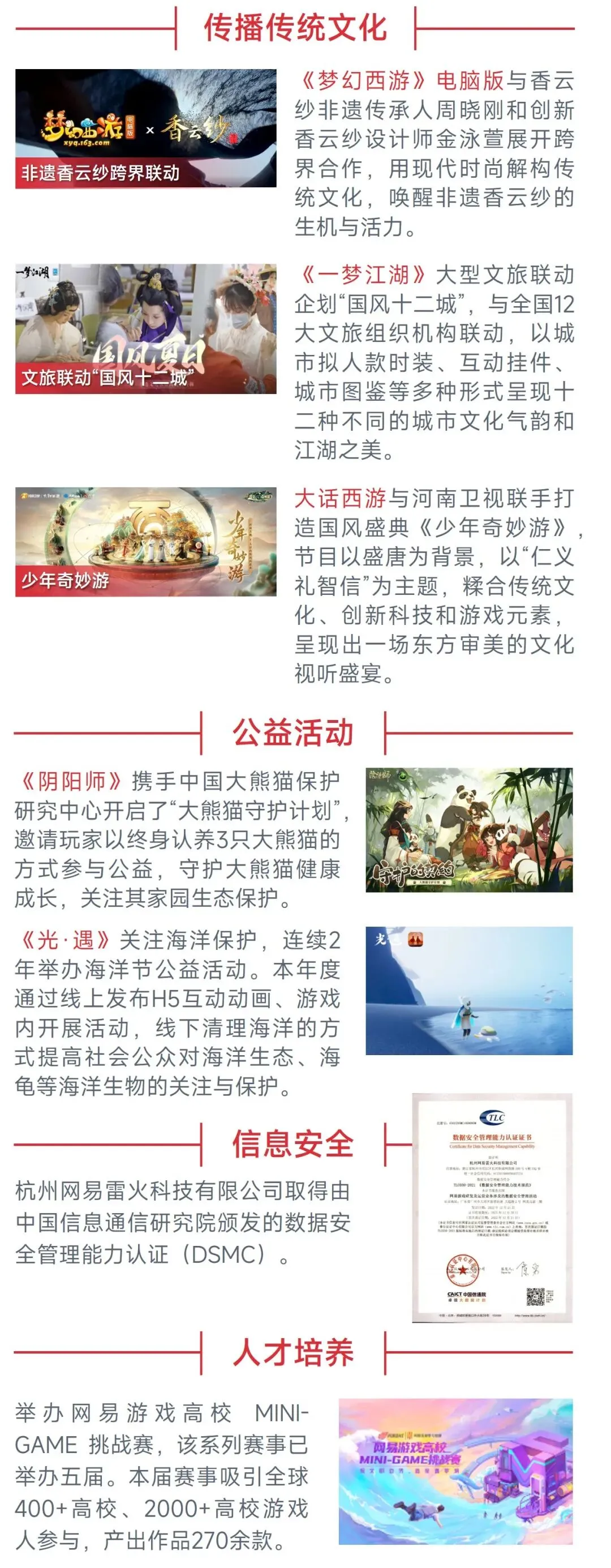 网易游戏社会责任践行体现在技术赋能、积极传播传统文化等方面。技术赋能表现在强化研发自主创新,并依托先进技术不断推动数实融合发展上。具体而言,网易游戏的研发自主创新主要以游戏相关技术为核心,在以自研引擎为代表的多个精尖端技术领域展开持续投入,进而提高自身的研发能力,并推动游戏科技的进一步发展,目前网易游戏在人工智能、VR、AR、云游戏、区块链等领域多项技术实力位居国内头部;数实融合则在文旅、机械工程等社会层面具备实际需求的领域发挥作用,进而深度挖掘游戏产业更多的产业价值、社会价值。传播传统文化方面,企业保持高布局力度,本年度相关事件达数十件。经过多年投入,网易游戏已将传统文化与产品研发、运营深度结合,沉淀了丰富的策略和形式,有效提升了在传统文化领域的布局影响力与布局效果。此外,网易游戏在信息安全、人才培养、社会公益等方面也持续推进,深度履行社会责任。